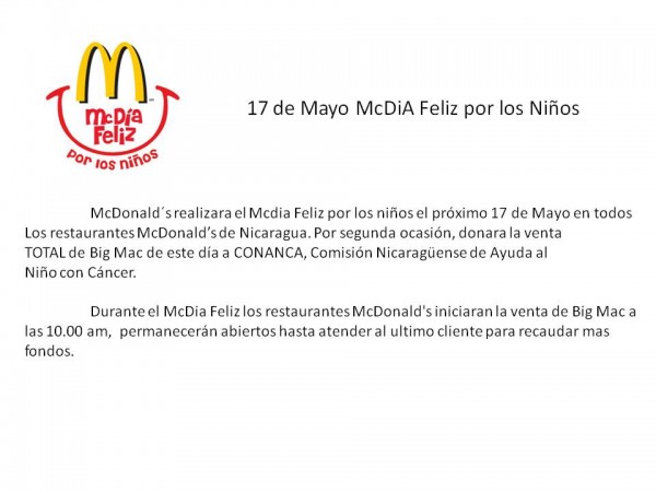 McDonald´s realizara el Mcdia Feliz por los niños el próximo 17 de Mayo en todos los restaurantes McDonald’s de Nicaragua. Por segunda ocasión, donara la venta TOTAL de Big Mac de este día a CONANCA, Comisión Nicaragüense de Ayuda al Niño con Cáncer.
